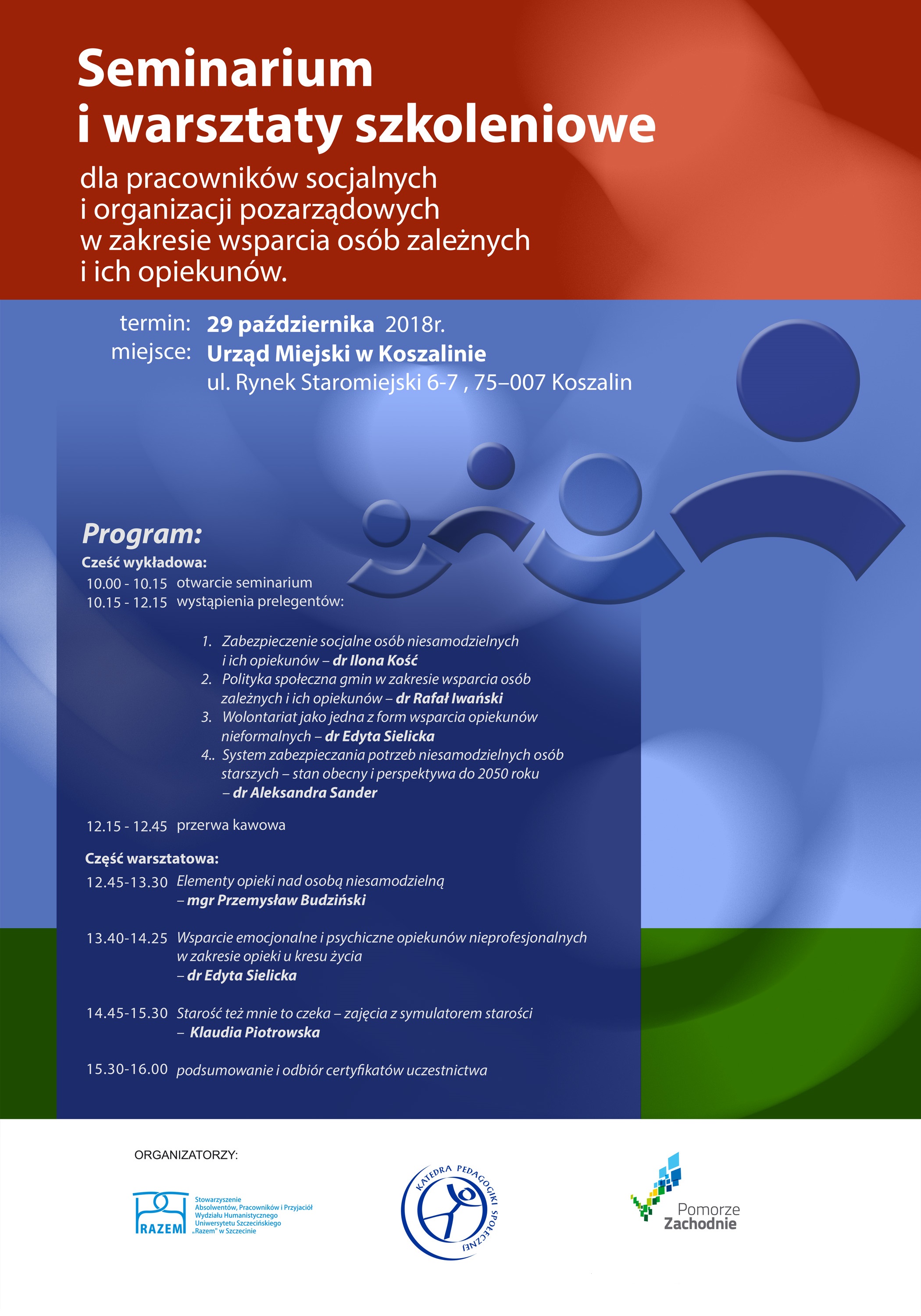 Serdecznie zapraszamy do udziału w bezpłatnym seminarium i warsztatach szkoleniowych dla pracowników socjalnych oraz organizacji pozarządowych w zakresie wsparcia osób zależnych i ich opiekunów, organizowanym na zlecenie Województwa Zachodniopomorskiego  przez Stowarzyszenie Absolwentów, Pracowników i Przyjaciół Wydziału Humanistycznego Uniwersytetu Szczecińskiego „RAZEM”. Zadanie realizowane w ramach Wojewódzkiego programu wyrównywania szans osób niepełnosprawnych i przeciwdziałaniu ich wykluczeniu społecznemu oraz pomocy w realizacji zadań na rzecz zatrudniania osób niepełnosprawnych pn. „Region wyrównanych szans”.