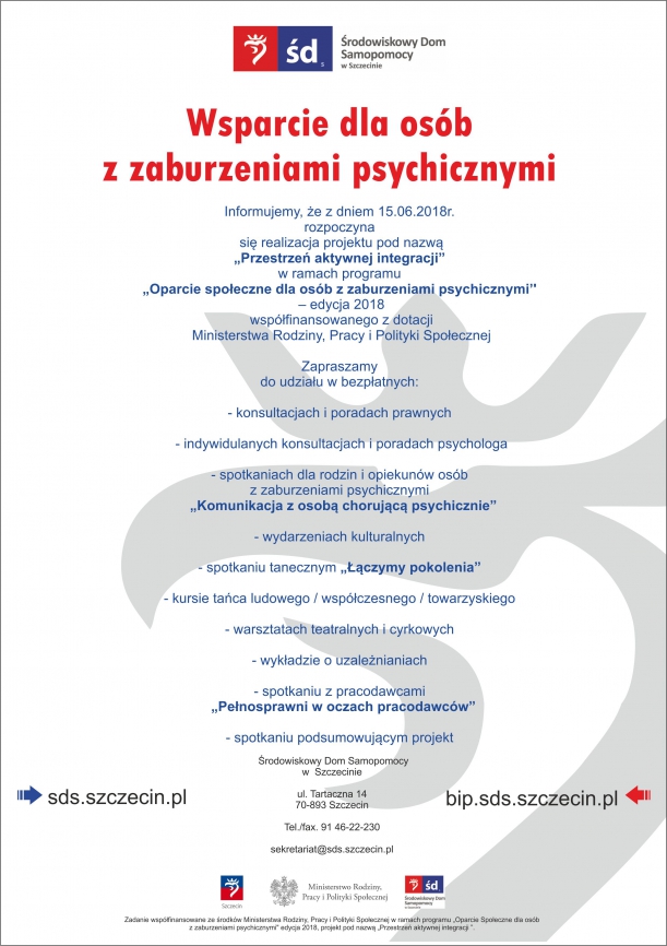 Uprzejmie informujemy, że Środowiskowy Dom Samopomocy w Szczecinie realizuje projekt pn. "Przestrzeń Aktywnej Integracji” współfinansowany z dotacji Ministerstwa Rodziny Pracy i Polityki Społecznej.